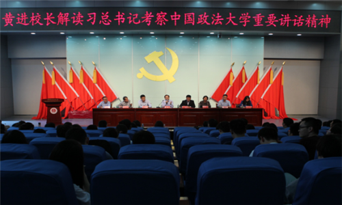 首先,黄进校长向大家介绍5月3日习近平总书记考察法大的行程和细节。习近平总书记先参观校情校史及办学成果展,亲切会见了我校资深教授代表。之后习近平总书记参加学生主题团日活动,他非常关爱青年学子,认真听取学生发言,与学生面对面进行亲切深入的交流,并围绕学习焦裕禄精神和学生成长成才发表重要讲话。他从自己的青年时代讲起、从自己接受的教育讲起,他认为作为一个共产党人,就要为老百姓做事情,人民对幸福的美好向往,就是我们党的奋斗目标。他勉励青年学生要立志做大事,不要立志做大官。最后,习近平总书记同我校师生代表和首都法学专家、法治工作者代表、高校负责同志进行座谈,并发表重要讲话。