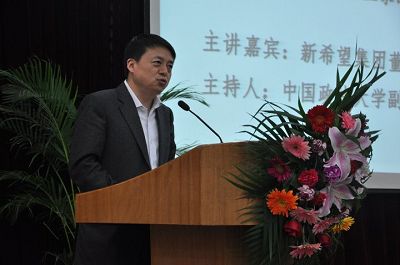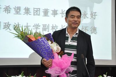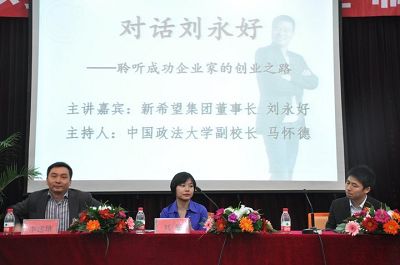 分党委副书记顾永强。首先马怀德副校长致辞并欢迎新希望集团到法大做客参观。随后,刘永好董事长介绍了新希望集团在食品、金融、重化工业领域的辉煌成就以及对国家税收、社会服务的贡献并绘制了新希望集团未来的发展蓝图,接着与现场同学就大学生创业需要具备的素养、民营企业的未来出路以及中国农业如何从分散走向集中、规模化等问题展开了积极、深入的互动,交流时间虽短,却让同学们深深感受到一个成功的民营企业家的人格魅力与艰苦创业的风雨历程。马怀德副校长做了精彩点评并高度评价了刘永好董事长精炼并富有教育意义的演讲,宣布了我校党委石亚军书记授予刘永好先生客座教授的消息,希望刘永好先生经常光临法大为学子们带来更多的精神财富。在随后的时间中王明宇老师邀请刘畅女士、李建雄部长以及王明贵主任与大家进行了一场亲切友好的交流。首先刘畅女士简要回顾了自己海外留学与回归集团的心路历程以及期间自己在价值观、人生观上经历的巨大变化,随后李建雄部长结合大学生就业的实际问题解析了企业在招聘人才时对应届毕业生个人素质的要求,李先生用“冰山理论”希望大学生努力具备优良的硬件与软件优势,占据职场竞争的有利位置,最后王明贵主任结合自己作为集团曾经的管理培训生的成长经历,鼓励大家通过真才实学、不懈努力去开拓事业的新航道。王明宇老师做了深刻、精炼的点评并希望新希望集团能经常来法大招贤纳士,用优秀的国产主播感召法大学子,讲座历时两个小时,于下午三点结束。