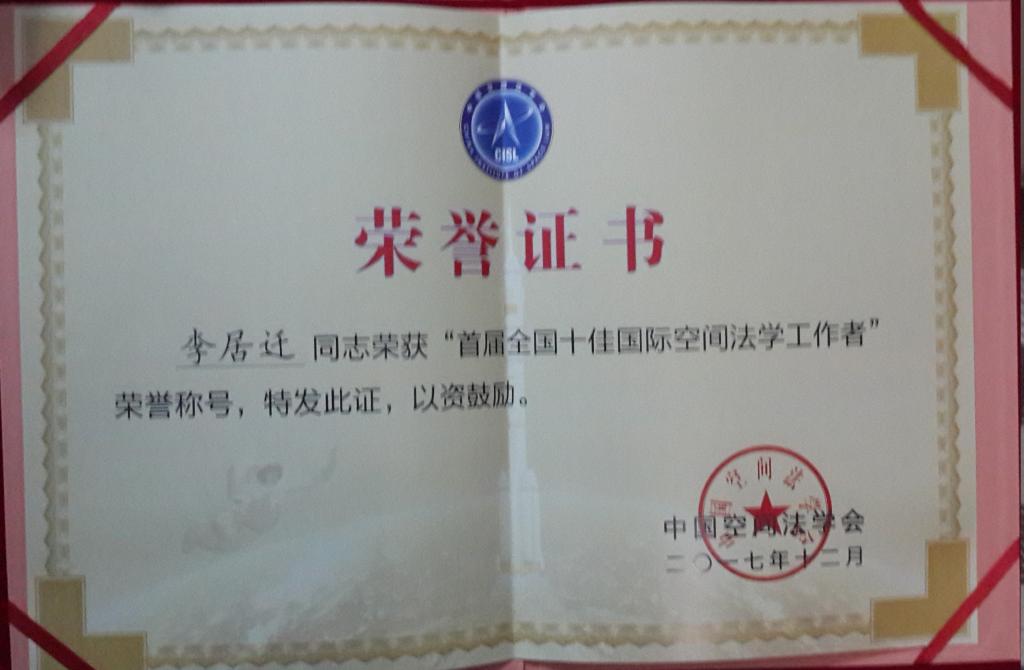 李居迁教授“首届全国十佳国际空间法学工作者”称号。表彰李居迁、廖敏文、郭红岩、唐雅以及国际公法研究所的全体老师们为国际空间法学研究以及在组织、指导国际空间法模拟法庭比赛、培养国际空间法学人才等方面所作出的突出贡献。我校是中国首家列名于《联合国空间法教育指南》的高等教育机构。李居迁等教授积极努力,指导我校前后十多次、连续八年获得空间法模拟法庭全国冠军,承担空间法学会多项年度课题和重点特设课题,出版多部/篇中英文学术著作和论文,参与联合国、世界经济论坛等多个国际组织和非政府间国际组织的重大学术和政府磋商活动,并作为主要专家参加航天法的立法工作,赢得了广泛的国际声誉,产生了良好的社会效果。