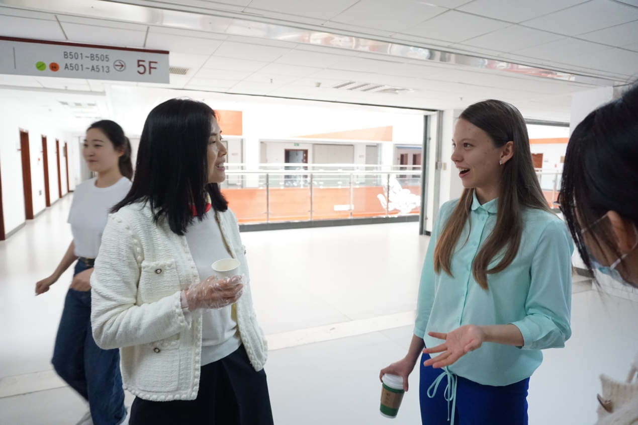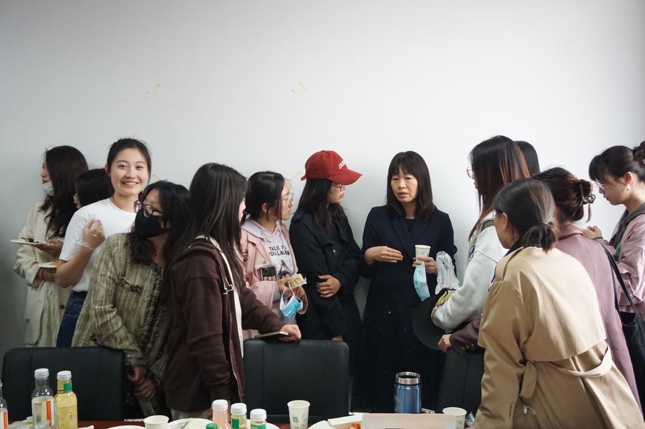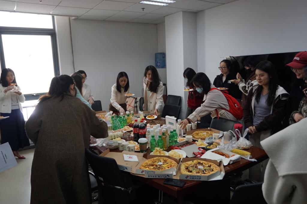 本次活动以午餐会的形式开展,过程轻松欢乐,老师和同学们准备了丰盛的食物和饮料共同分享。大桌子上东西方饮食交汇,不仅有披萨、薯片、饼干、虾片、蛋糕以及琳琅满目的各类零食饮料,还有包子、烤冷面和凉皮这类备受欢迎的中式美食,师生分享美食,进行学术思想交流。
