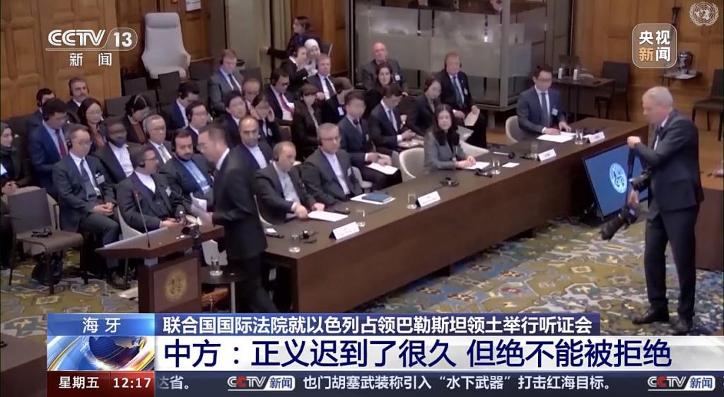 2024年2月22日上午,中国外交部条法司司长马新民代表中国向国际法院全面阐述了中国关于联大第77/247号决议中的两个法律问题的立场,就国际法院对这两个法律问题是否具有咨询管辖权、是否应当发表咨询意见、以色列是否侵犯巴勒斯坦人民的自决权、以色列占领巴勒斯坦领土是否违反国际法等问题发表了意见。这是中国第二次参加国际法院咨询案件的庭审,受到高度关注和积极评价。国际法院预计在今年下半年就联大的请求作出回应。