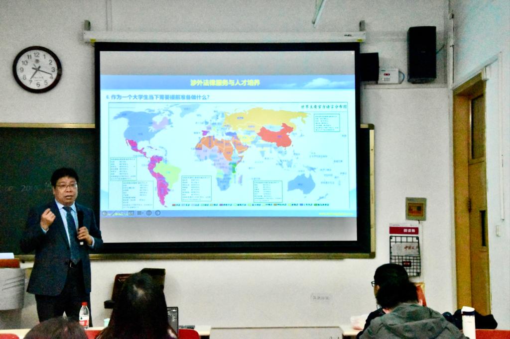 首先,贾怀远先生结合自身丰富的涉外法律服务经验,向同学们分享了他在外从事涉外法律工作的各种案例,展示了涉外法律工作者的工作环境、工作条件和工作状态。他指出,想象和现实可能大不相同,身为涉外法律工作者,复杂多变的工作环境条件和高强度的工作状态是现实中的常态,同学们要对此有足够的思想准备,持续艰苦奋斗。在奋斗的过程中,同学们要不断精进专业水平和英语水平,做到专业过硬。同时,贾怀远先生结合他在世界各地的涉外法律一线的工作经历,指出涉外法律人才必须有一定的实践经历,亲临一线现场,这样才能不断促进涉外法律服务经验的积累与能力的提升。
