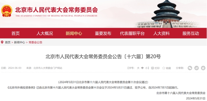 《北京市外商投资条例》(以下简称《条例》)已由北京市第十六届人民代表大会常务委员会第十次会议于2024年5月31日通过,自2024年7月1日起施行。《条例》全文共7章44条,旨在对接国际高标准经贸规则,深化制度型开放水平,推动营商环境更加优化。这是北京市首部针对外商投资的专门性法规,不仅有效实施《中华人民共和国外商投资法》,还根据北京特点突出了针对性、服务性和统筹性,积极回应外资企业的关切,就政策制定、政府采购、政府守约践诺、数据跨境流动、外汇便利、知识产权保护、技能人才引进、政企沟通机制等问题,逐一进行了制度设计。