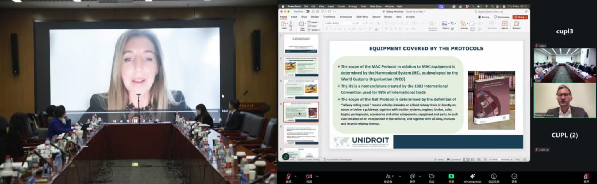 /涉外法治学院郭帅老师担任主持人,国际统一私法协会高级法律官员William Brydie-Watson围绕《MAC议定书》最新进展及对中国的效益分析进行发言,中铁建工集团有限公司国际事业部法律顾问柴聪简述了《矿业、农业和建筑设备议定书》对中国建筑承包商的影响;日本中央大学法学院教授Megumi Hara从《MAC议定书》的亚洲视角出发展开阐述;北京奋力律师事务所高级顾问兼北京仲裁委员会仲裁员吕琦简述了我国MAC金融及MAC议定书应用中存在的问题;美国国际法研究所法律改革项目主任Marek Dubovec就《MAC议定书》与《铁路议定书》的协同作用:促进基础设施项目融资与经济发展的互补机制进行了发言。