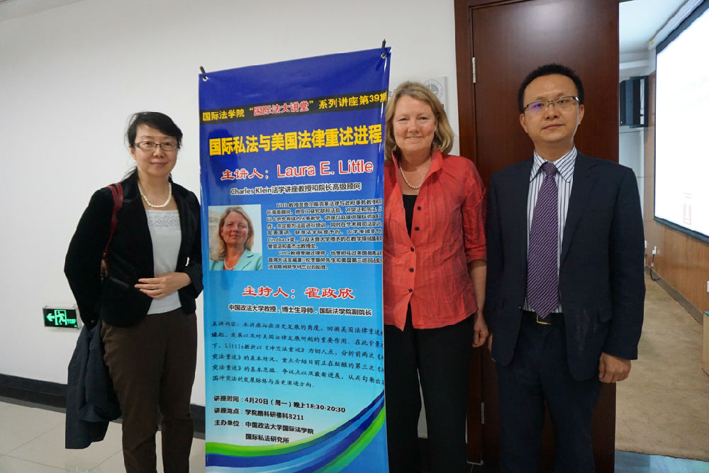 2015年4月20日晚六点半,我校国际法大讲堂系列讲座“国际私法与美国法律重述进程”在学院路校区科研楼B211举行。Charles Klein法学讲座教授和院长高级顾问Laura E.Little为我校师生做了一场精彩的演讲。