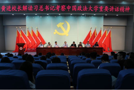 首先,黄进校长向大家介绍5月3日习近平总书记考察法大的行程和细节。习近平总书记先参观校情校史及办学成果展,亲切会见了我校资深教授代表。之后习近平总书记参加学生主题团日活动,他非常关爱青年学子,认真听取学生发言,与学生面对面进行亲切深入的交流,并围绕学习焦裕禄精神和学生成长成才发表重要讲话。他从自己的青年时代讲起、从自己接受的教育讲起,他认为作为一个共产党人,就要为老百姓做事情,人民对幸福的美好向往,就是我们党的奋斗目标。他勉励青年学生要立志做大事,不要立志做大官。最后,习近平总书记同我校师生代表和首都法学专家、法治工作者代表、高校负责同志进行座谈,并发表重要讲话。