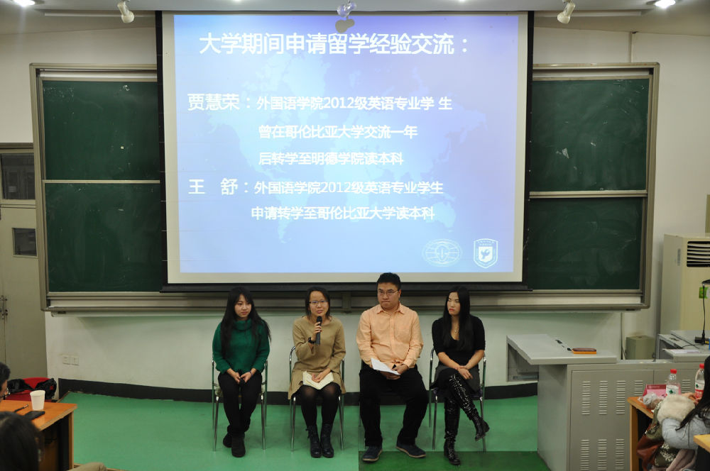 2014级涉外班辅导员刘瑾老师参加了此次交流会。同时,我校2012届毕业生,现哥伦比亚大学在读、耶鲁大学JD(美国法律博士)在读的徐周峰、赵丹阳,我校2012级学生,现已转学至明德学院、哥伦比亚大学的贾慧荣、王舒来担任本次活动的主讲嘉宾。