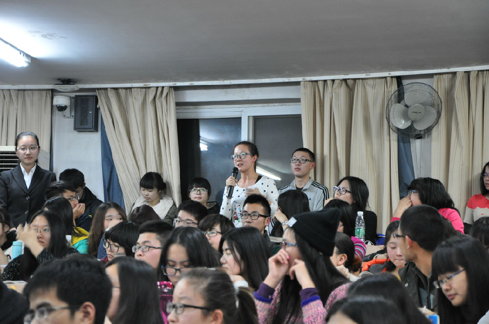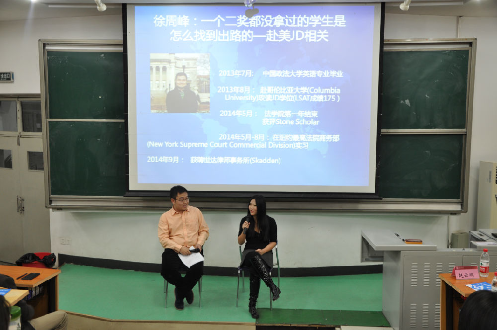 随后,徐周峰师兄、赵丹洋师姐为我们讲述他们的经历。徐周峰师兄回忆了他选择出国留学的动机,并为我们指出了一条出国的方式——赴美JD。同时,他向我们传授了考LSAT、托福的经验。赵丹洋师姐则介绍了自己出国后的学习生活,亦向同学们传授了转学到美国顶尖法学院的技巧。之后,贾慧荣、王舒两位同学同样细致、认真地与同学们分享了她们在大学期间成功转学美国明德学院和哥伦比亚大学的成果经验,鼓励同学们提早树立目标,并朝着目标努力奋斗。