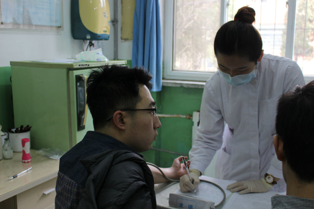 上午八点左右,大厅内已聚集了很多献血志愿者,他们正在展台前填写献血登记表。校医院门口张示了献血流程的示意图,献血志愿者们有条不紊地按照流程执行献血前的各项程序,包括微机体检和血样血压的检测。大厅一角摆放着成堆的早餐,是为验血后的同学们准备的,以免同学们空腹排队等待献血。待体检结果出来后,合格的同学将领取合格献血表,然后到三楼的会议室进行献血,校医院还为同学们提供了献血后留下观察的休息室。献血结束后同学们将登记领取献血证和纪念品以纪念这一次献血活动。