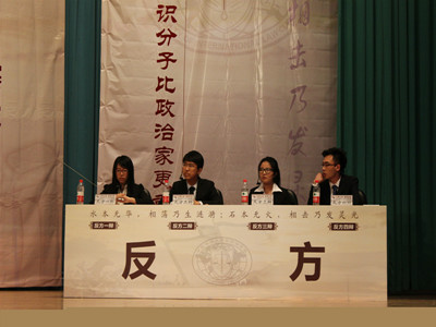 则相反。双方辩手向在场观众问候之后,比赛开始。双方一辩选手围绕辩题先后陈词他们各自的观点。双方代表开篇立论,主题鲜明,陈词慷慨激昂,现场观众不禁连连拍手叫好。正方辩手们措辞精辟,言辞犀利,展现出咄咄逼人的气势。反方辩手也毫不示弱,连连反击。攻辩环节与自由辩论环节双方更是争锋相对、步步紧逼,现场气氛迅速升温,达到白热化阶段。最后总结陈词,比赛结束。