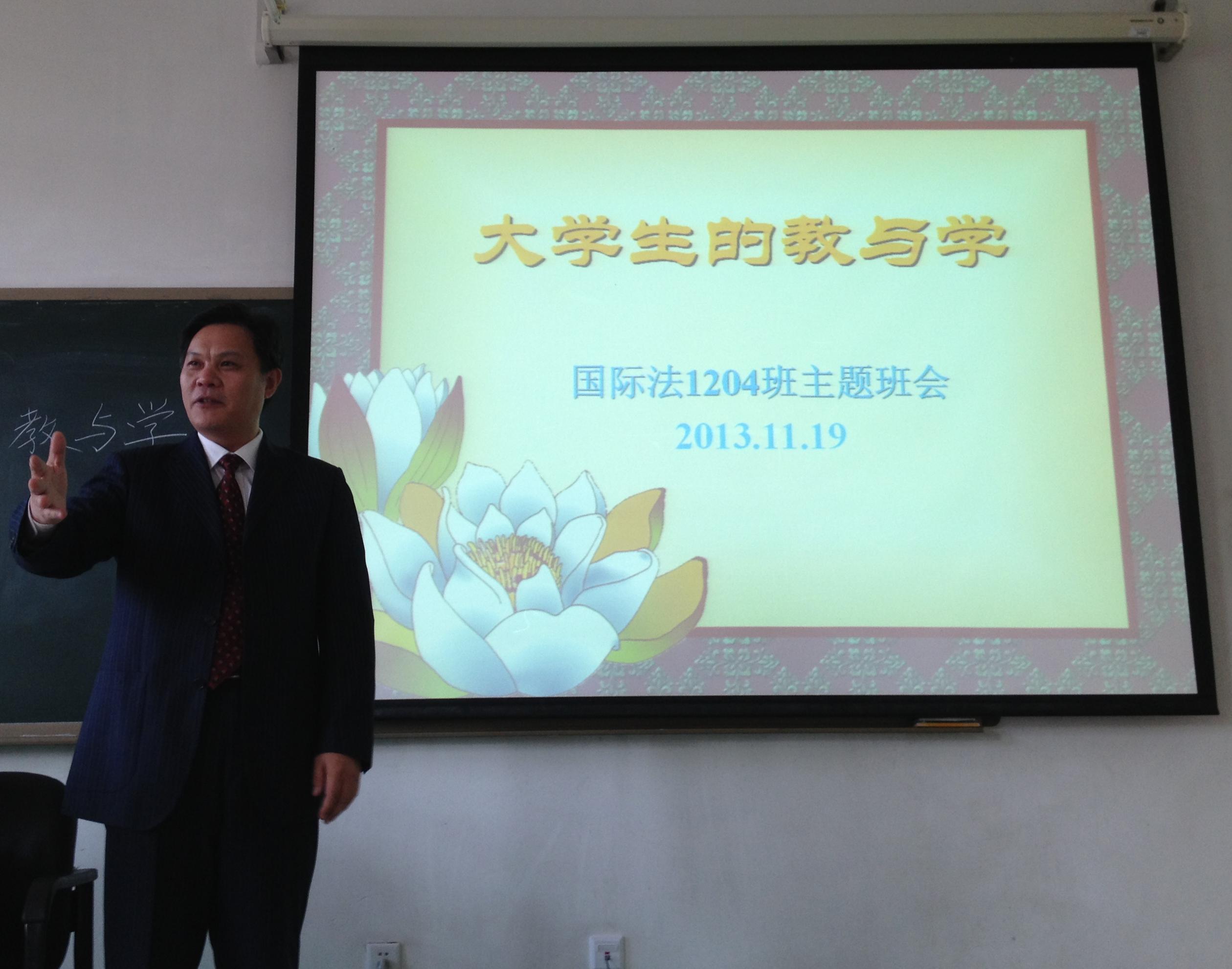 天气虽然很冷,但1204班每个同学脸上都洋溢着幸福的笑容,因为林老师为大家带来了久违的“班主任”的温暖。在作自我介绍时,同学们都不约而同地提到一个话题,那就是“非常高兴林老师能够做我们的班主任”,同时大家都十分肯定“国际法1204班”是一个优秀的集体。接着,林老师组织同学们围绕“大学生的教与学”这一主题展开讨论,并结合班会主题反思自身情况。大家踊跃发言,各抒己见,提出了很多独特的见解。与林老师偕行的几位研究生、博士生师姐也做了发言,表达了自己对同学们的期望,希望大家珍惜大学的美好时光造就自己早日成长为德才兼备的优秀大学生。班会始终在轻松活泼却又不失严肃的氛围中进行,其间林老师还播放了一段求学与成长的视频,使同学们感触良深。最后,林老师希望大家珍惜缘分,团结互爱,常怀感恩,善学笃行,传承大学精神,做一个合格的大学生,成长为优秀的人才。