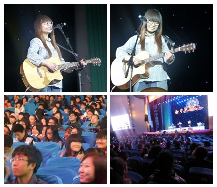 第四个节目是梁晋菲带来的吉他独唱《突然之间》。晋菲师姐有种让全场都安静下来听歌的魔力,台下的人儿听得痴迷。此时此刻,忽然之间,她的心里想起了谁。