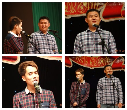 第二个节目是法大曲艺团演绎的相声《上学那些事儿》。节目才刚开始,两位演员神气活现的表演就足足吊起了同学们的胃口。一身入戏的装扮,增添了演员的喜感;滑稽搞怪的神情,灵动活现的肢体语言,博得了现场的掌声阵阵。两位演员的精彩表演给现场观众带来了一场丰盛的视听盛宴,留下了回味无穷的快乐。