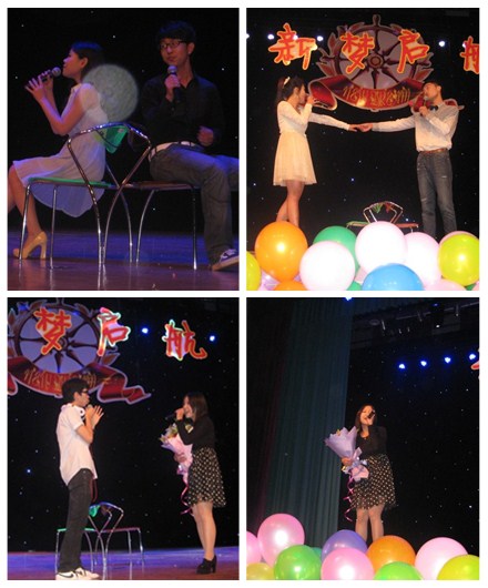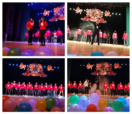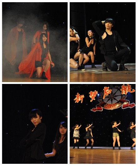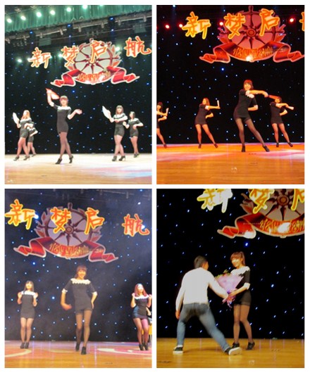 新生报到的场景,勾起了观众两个多月前的回忆。短剧之后是开场舞,分为三段,第一段是中国风的舞蹈,演员们婀娜多姿,服装绚彩华丽,为观众带来了美和优雅的表演。开场舞第二段,有国经学生会的部长们表演,他们身穿正装,随着音乐起舞。师兄师姐们在台上忘我地表演,为观众献上精彩。开场舞第三段,是现代风格的舞蹈,很high,演员充满了活力。现代舞将现场气氛带向了第一个高潮,现场所有观众的情绪都被调动,期待着后面更加精彩的节目。