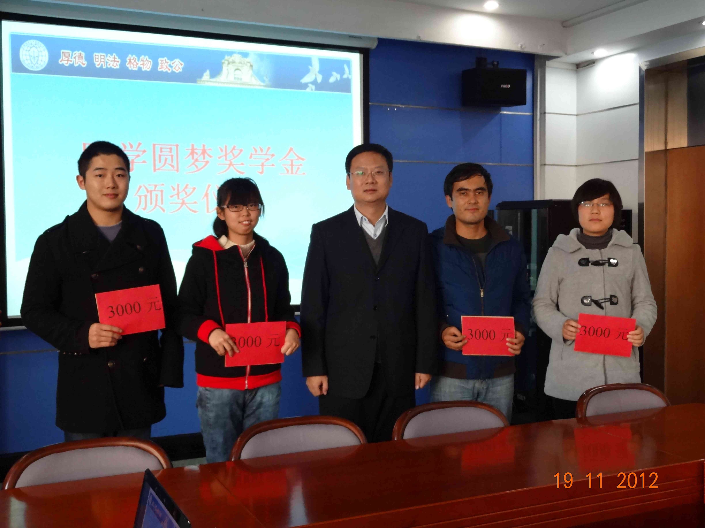 分党委副书记兼副院长顾永强老师,分团委杨俊丽老师, 2012级辅导员张西峰老师,以及获得奖学金的夏玉杰、韩林林、喻萍、阿卜杜外力等学生参加了本次颁奖仪式。