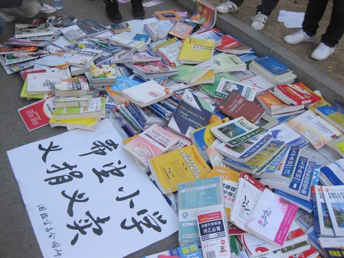 学委会调研部的旗子,一个鼓鼓的募款箱。看来他们收获颇丰啊。  记者从一位热心的同学那得知,他们从今早6:00就来“占摊”,8:00摆摊,一直要卖到下午5:00。而募得的善款,讲带着学校师生的爱心,飞往遥远的海南。在那的一所希望小学,这些钱的一部分将用来给孩子们买文具,剩下的钱将资助一个爱学习却遭遇不幸的六年级学生,她的父亲前年不幸去世,现在家中还有哥哥姐姐也在上学,却只能靠妈妈务农得来的微薄收入生活,但愿这些钱能帮助她们一家度过难关,传递社会对她们的关爱。  在义卖的物品中,有各种教科书,辅导书,还有英语词典,光盘,各类杂志,甚至还有两本崭新的《明朝那些事儿》,除了书,还有一推看上去还很新的衣服,几个毛绒玩具,一个据说是大四师姐亲手做的枕头……这些东西,都是即将毕业的师兄师姐尽自己所能贡献出来的,调研部的同学们每一次去“拜访”,都能“满载而归”,即将告别校园,走入社会的他们,用一种无言的方式传递着他们依旧坚守的梦想和对母校深深的眷恋,也祝福他们的明天越来越好。  为这次活动的顺利举办而努力的所有同学,都在用自己的行动践行着一个当代大学生的价值追求,可能他们做得很有限,但他们做得很努力,希望这样的活动会越来越多,参与的人越来越多,传递希望和热情的人也越来越多。