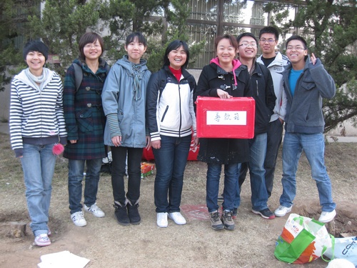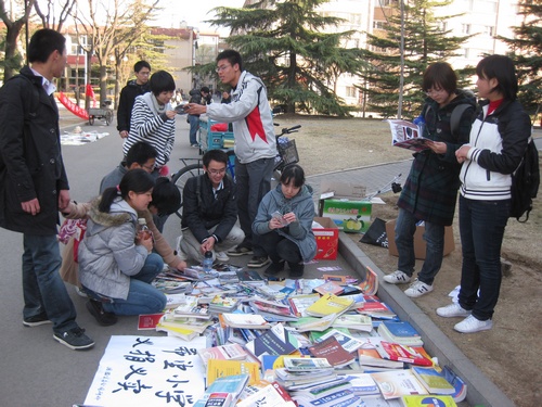 | 2011年3月25日,一个普普通通的日子,迎着灿烂的朝阳,仰望着湛蓝的晴空,便让人感觉充满了希望和力量。风儿裹挟着寒冷吹在匆匆走过的同学身上,也吹在一群在法渊阁后面的道路上忙碌的同学身上,只见他们小心地从一个个看上去很重的箱子中陆续拿出一些书,文具,光盘,还有衣服,然后有规律的摆放整齐,诧异的目光匆匆掠过……  中午,下课,人潮密集的涌向那条路,还是他们,这下终于明白了,他们这是在义卖呢,物品两边的同学都怀着一种满足而愉悦的心情达成一笔笔交易,他们嘴角那浅浅的微笑告诉我:今天,他们会拥有一个好心情。  下午,4:30,再次经过那条路,空空的四周,烘托出两个红红的标志,一面写有国产主播