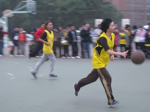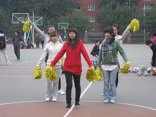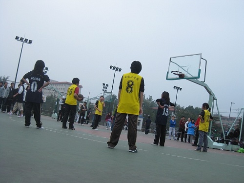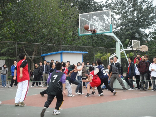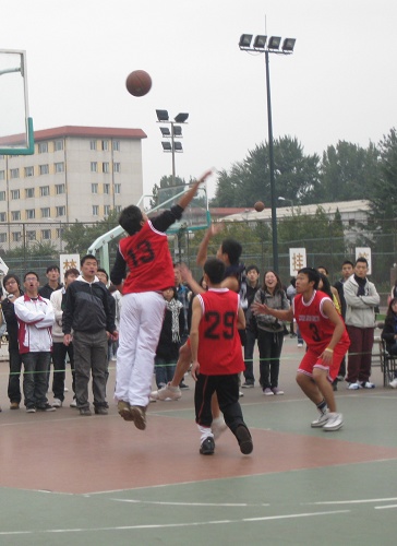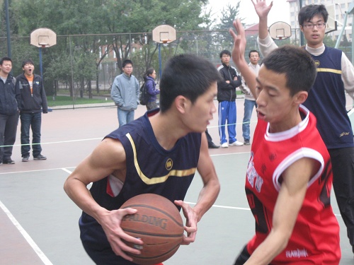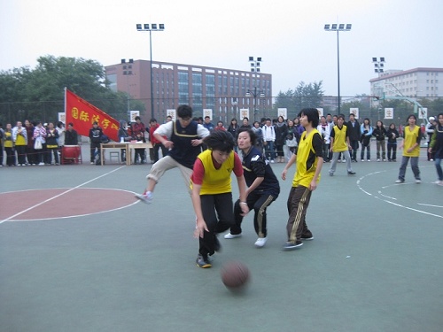 和新闻与传播学院的比赛。  虽然时值正午但北京的深秋是冷风袭袭,然而微冷的天气丝毫没有使比赛降温。开场哨声刚刚吹响,双方队员就开始了激烈的拼抢,国经连连入球将比分拉开,并且一直掌握着主动。新闻院男生们虽然几次抢断但仍不能遏制国经的进攻。上半场结束,04:22,国经领先。  中场休息时,国经的啦啦队还做了精彩的表演,为比赛增添了一抹绚丽的色彩。  下半场比赛的节奏更加紧凑,新闻院加紧了攻势,不断突破国经的防守将比分差距减小。当然,上半场的优势为国经的胜利奠定了基础,一连几次抢断国经在最后的时刻锁定胜局,以48:12取胜。  如果说上一年国经男篮创造了历史,那么今年的他们又将怎么继续辉煌呢?  冠军杯的路上国经的队伍高喊着“国经是冠军”。