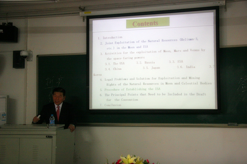 接下来,金斗焕教授分别从国际宇宙组织(ISA)的设置背景、月球上天然资源的共同开发和国际宇宙机构的设置、当今外太空强国(地区)对于月球等星体的开发现状、开发过程中所面临的法律问题和解决措施等方面进行了详细、深入的讲述。通过讲述,金教授指出了国际宇宙组织(ISA)将会成为未来全人类开发月球和其他天体的一条新路,对于未来月球等其他天体的开发和保护将会发挥重大作用。