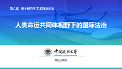 论坛由2017级博士生陈苏同学主持,来自两个年级的4名同学围绕论坛主题,从不同角度阐述了对人类命运共同体视野下国际法治的认识。2016级博士生朱俊宇同学以《论对条约退出权的限制》为题,阐述了明示和默示条约退出权的概念以及对明示和默示条约退出权的限制,并结合人类命运共同体理念指出国家在行使条约退出权时需认真考虑国际社会整体利益,应站在全球的高度,无损于国际社会的共同利益和普适的国际社会正义价值。最后通过实例分析探讨了合理限制条约退出权的相关措施。